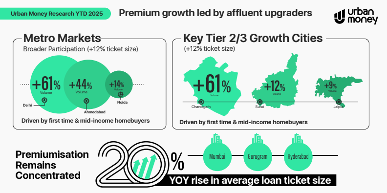 Large urban markets such as Delhi, Ahmedabad and Noida are increasingly reflecting volume-driven growth supported by stable affordability, rather than sharp premiumisation. Delhi and Ahmedabad recorded 61% and 44% year-on-year growth in home loan volumes, even as average loan ticket sizes rose by a measured 12%, indicating a broader base of end-user participation rather than concentration among higher-income borrowers.